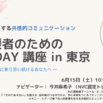 2024年5月29日 / 最終更新日時 : 2024年5月29日 大学NVC 共催イベント [6/15] 対人支援者のためのNVCエッセンシャル 1 DAY(東京) 「わたし」から始める、健やかでやさしい関係づくり あらゆる感情の奥にも大切な願いがある。NVC (Nonviolent Communication / 共感的コミュニケーション)は、そのような観点から、こころと言葉に意識 […]