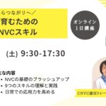 2023年4月30日 / 最終更新日時 : 2023年5月3日 大学NVC 経験者向け [5/27] 対話を育む9つのNVCスキル -対立からつながりへ- 「わかりあえない」状況に置かれたとき、どんな風に対話を紡いでいくことができるでしょうか?このプログラムでは、NVCを日常にいかす上での「つまづき」ポイントをていねいに紐解きながら、NVCを対話にいかすための9つのスキルを […]