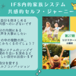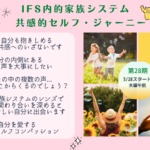 2024年3月4日 / 最終更新日時 : 2024年3月26日 GotoGo 共催イベント 【満員御礼✨Online3/28-5/9(木曜午前)】第28期 IFS 内的家族システム初級講座 〜パーツ意識で全体性とつながり自己理解を深める旅〜〔後藤ゆうこ&剛〕 ✨NVC x IFS(内的家族システム)のススメ✨ 〜NVCのニーズ意識と共にIFSのパーツ意識で全体性とつながり自己理解を深める旅〜 NVCを実践していても、 望むほど自分とつながれなかったり、 自己共感が難しいと感じ […]