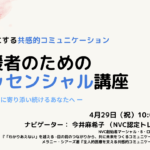 2024年4月5日 / 最終更新日時 : 2024年4月29日 大学NVC 共催イベント [4/29] 対人支援者のためのNVCエッセンシャル 1 DAY 講座 「わたし」から始める、健やかでやさしい関係づくり あらゆる感情の奥にも大切な願いがある。NVC (Nonviolent Communication / 共感的コミュニケーション)は、そのような観点から、こころと言葉に意識 […]