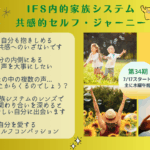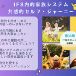 2025年6月27日 / 最終更新日時 : 2025年7月4日 GotoGo オンライン 【満員御礼✨Online7/17-9/4(主に木曜午前)】第34期 IFS 内的家族システム初級講座 〜パーツ意識で全体性とつながり自己理解を深める旅〜〔後藤ゆうこ&剛〕 ✨NVC x IFS(内的家族システム)のススメ✨ 〜NVCのニーズ意識と共にIFSのパーツ意識で全体性とつながり自己理解を深める旅〜 NVCを実践していても、 望むほど自分とつながれなかったり、 自己共感が難しいと感じ […]