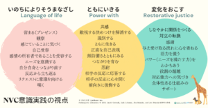 NVC(Nonviolent Communication)とは、「何が問題か(何が正しく何が間違っているか)」のかわりに「何が人生を豊かにするか」に着目することによって、こころの中にも外側にも平和をつくる、自分も相手も大切にする(たがいをいかしあう:Power With)コミュニケーション手法です。
