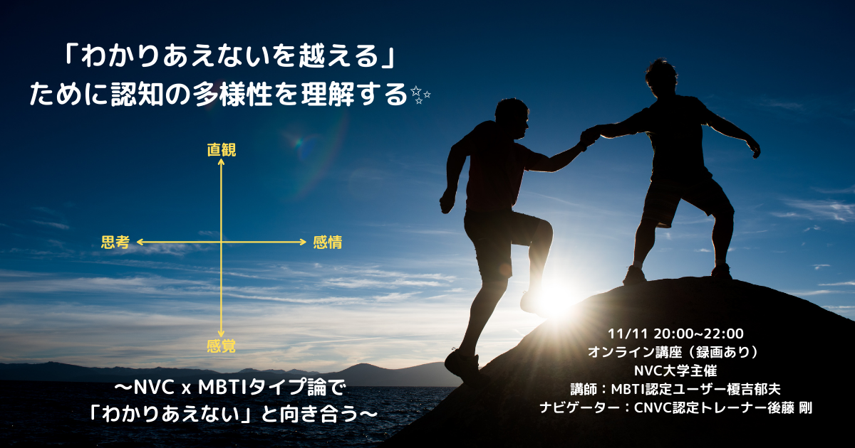 このオンライン講座では、MBTI認定ユーザーの榎吉郁夫さんをお招きして、「わかりあえない」を越えるための認知の多様性を理解するために「NVC x MBTIタイプ論」という観点をご紹介しようと思います。